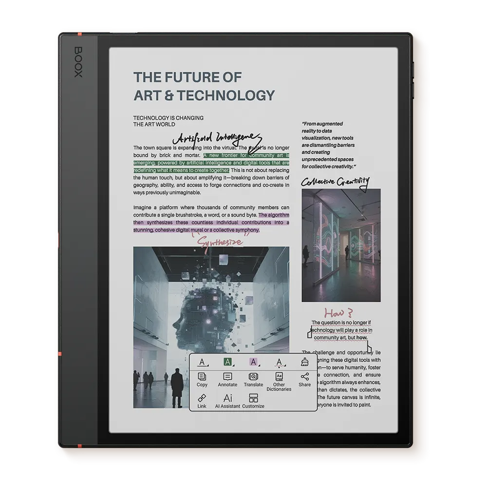 10,3-calowy ekran E ink Kaleido 3 w Note Air5 C zapewnia zapierające dech w piersiach realistyczne kolory i wyraźne szczegóły, jednocześnie będąc delikatnym dla oczu. Burza mózgów, przeglądanie raportów i praca na kolorowym płótnie, które jest genialne, podobne do druku i responsywne.