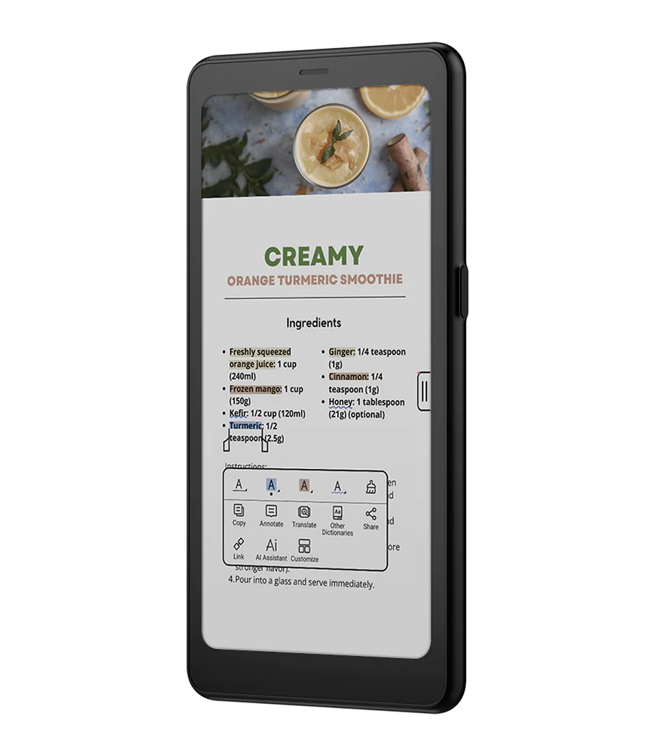 Kompaktowa forma zapewnia pewny, wygodny chwyt jedną dłonią i świetnie sprawdza się w podróży.Ekran E Ink idealnie nadaje się do czytania e-booków, przeglądania stron internetowych i korzystania z aplikacji mobilnych - wyraźny obraz, mniej zmęczenia oczu i pełna czytelność.