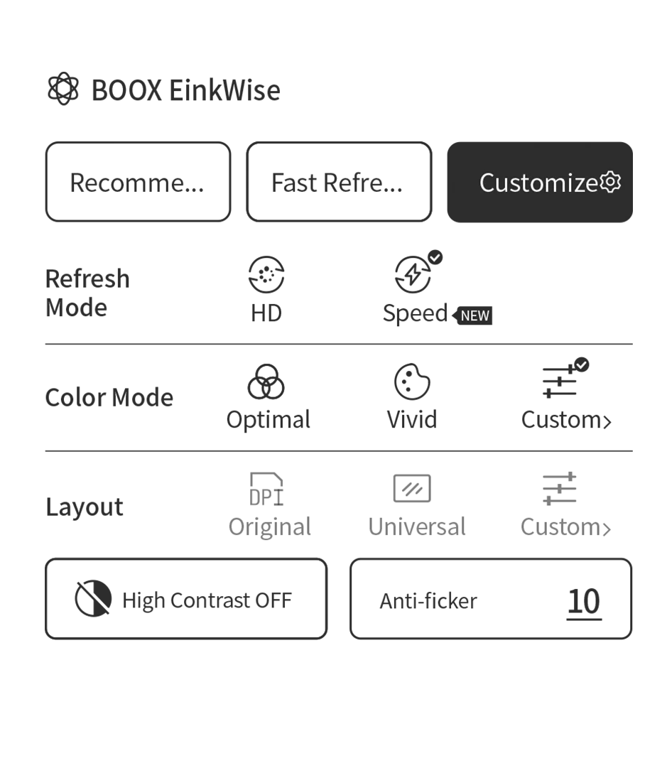 Szybko przełączaj się na gotowy tryb dla przeglądania stron, czytania lub pracy w aplikacjach dzięki EinkWise. Dostosuj preferowany tryb odświeżania, tryb koloru oraz układ.