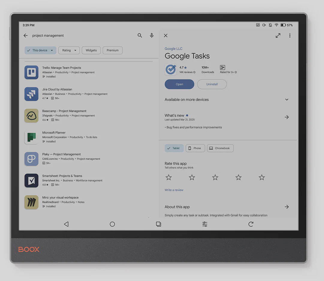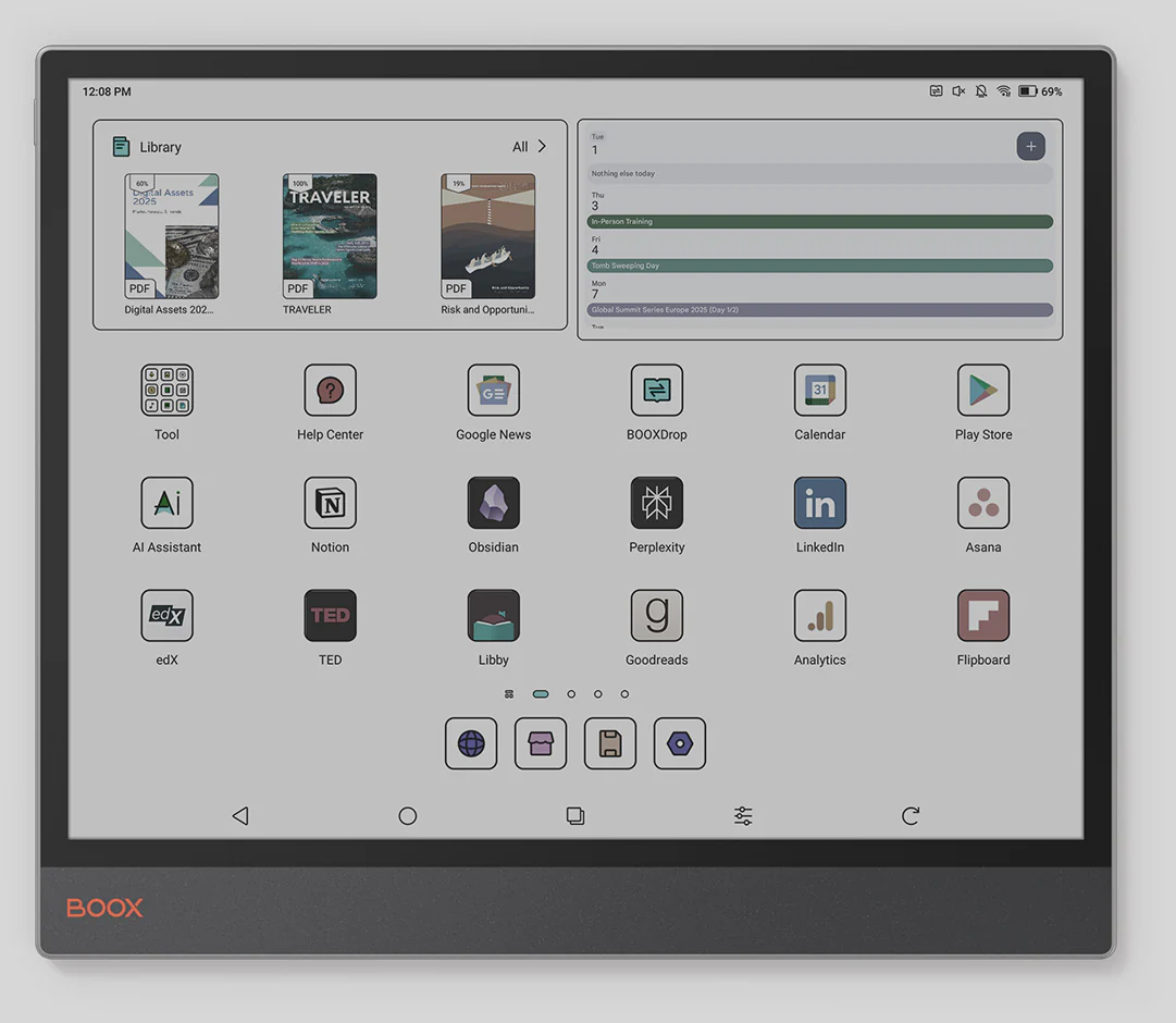 Wygodne zarządzanie obowiązkami. Interfejs Boox Tab X C przypomina tablet i umożliwia szybki dostęp do najważniejszych aktualizacji dzięki konfigurowalnym widżetom.